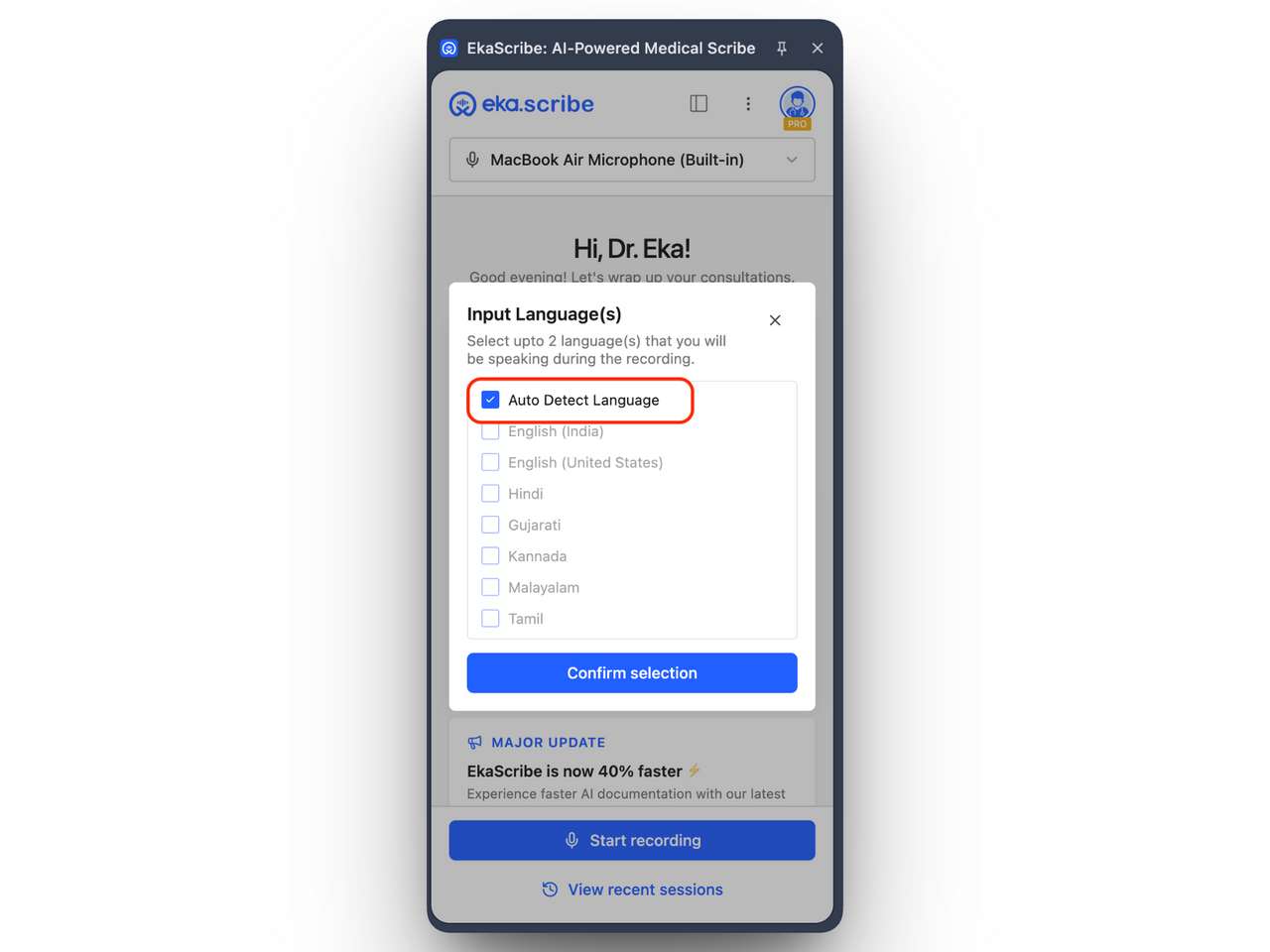 Once you enable auto-detect language in your default preferences, EkaScribe will automatically detect the input language based on your system or speech. This means you no longer need to manually select the input language every time you start a session.