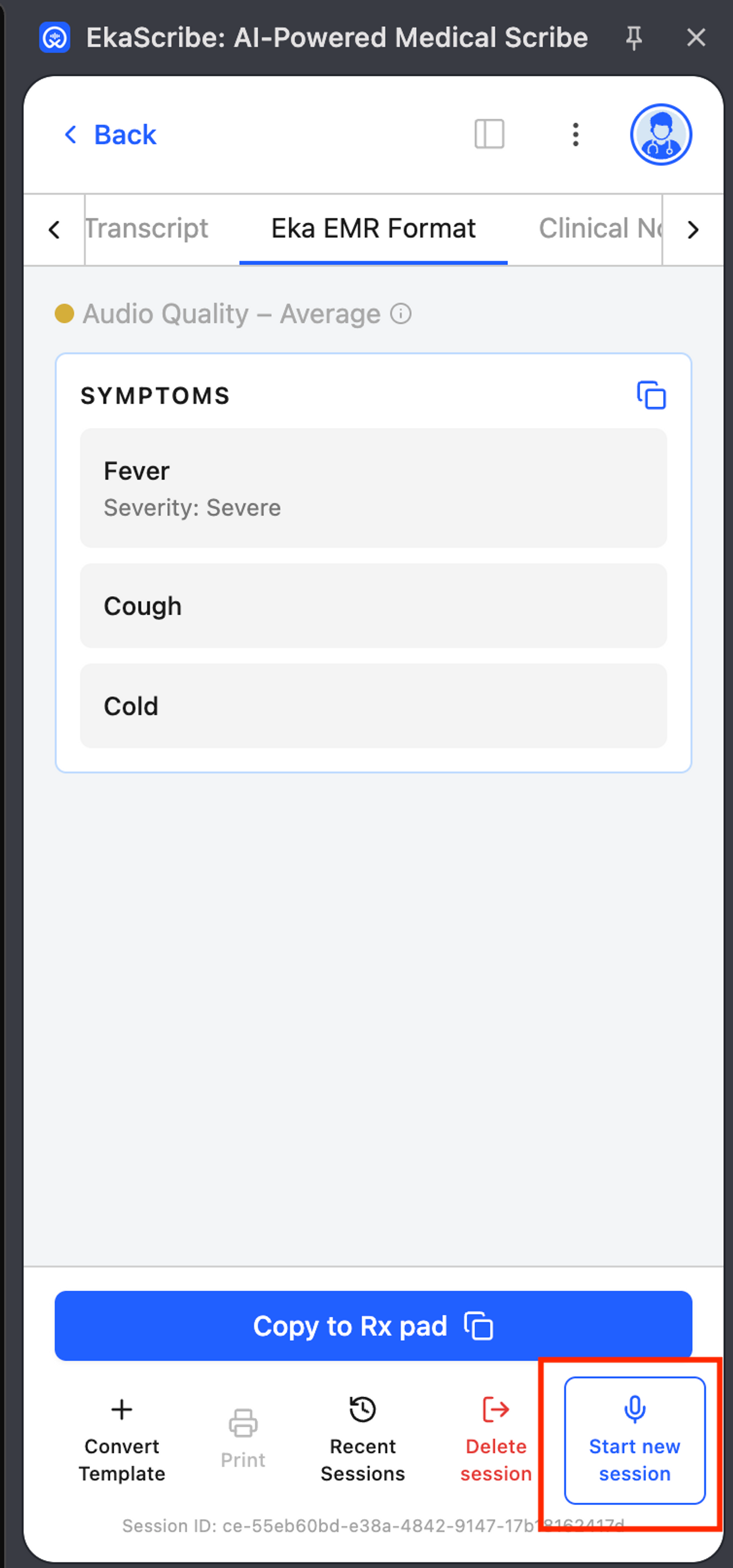 When you begin a new session from the output screen, recording will start automatically—so you can jump straight into your next consultation without any extra clicks or delays. This helps maintain your flow, especially during back-to-back patients.